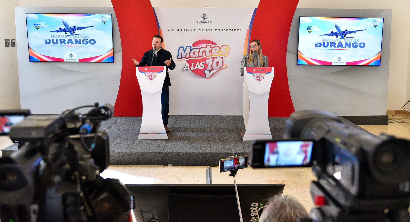 La secretaria de Turismo, Elisa Haro, señaló que esta es una buena etapa para Durango, gracias a las gestiones del Gobernador Esteban y al trabajo coordinado con los aeropuertos, así como con los gobiernos de Sonora y Nuevo León, para seguir ofertando el turismo en las ciudades hermanas y que todos los visitantes conozcan los atractivos con los que cuentan cada entidad.