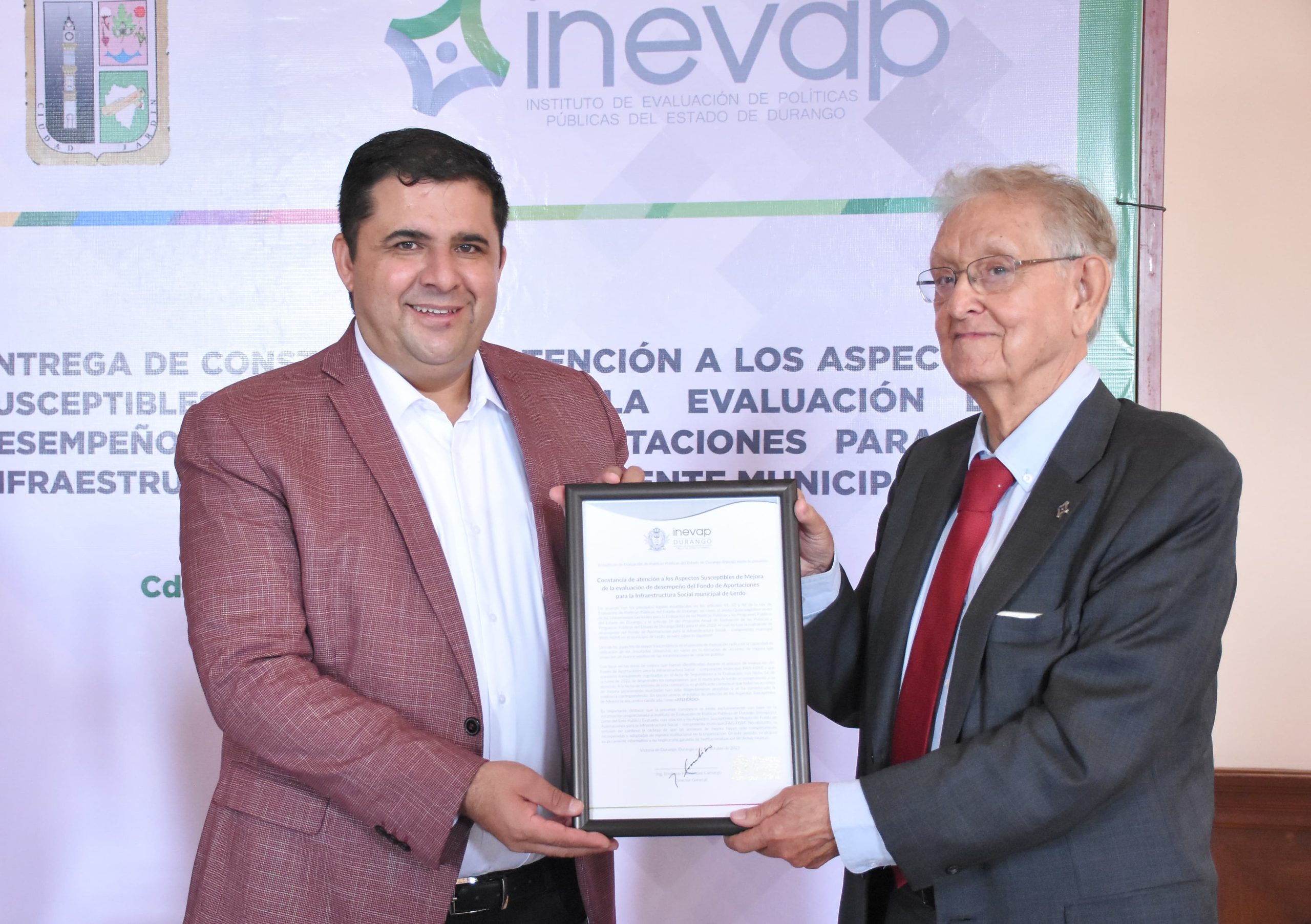 Lerdo, 11 octubre 2023.– Teniendo como sede el Salón Azul de la Presidencia Municipal de Lerdo, el alcalde Homero Martínez Cabrera recibió una constancia de mejora en la evaluación de desempeño del Fondo de Aportaciones para la Infraestructura Social por parte del Instituto de Evaluación y Vigilancia de la Administración Pública (INEVAP). El consejero presidente del INEVAP, Emiliano Hernández Camargo, entregó personalmente este reconocimiento.