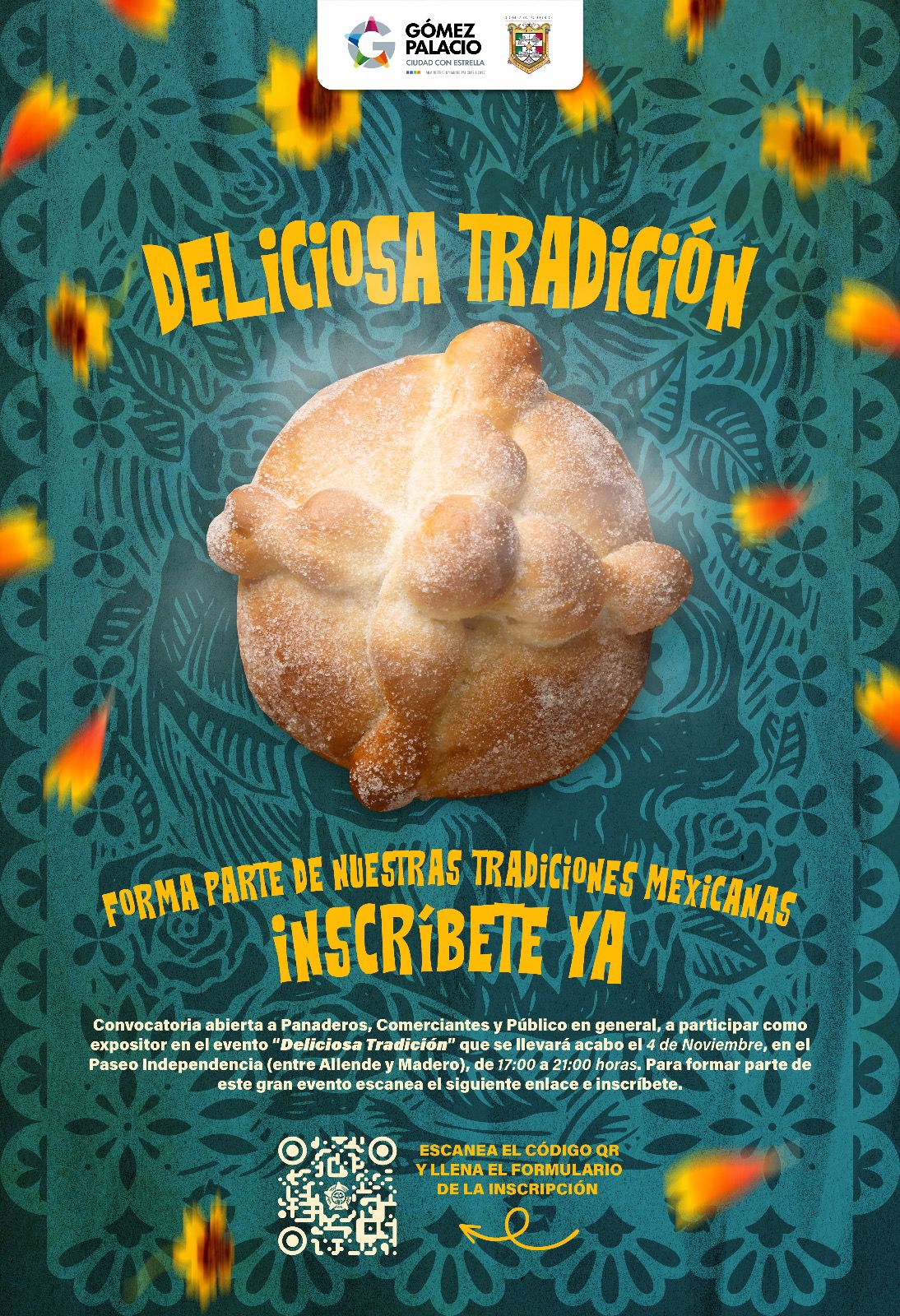 Con la finalidad de alentar entre la población a las tradiciones mexicanas, por la festividad del Día de Muertos, el Ayuntamiento de Gómez Palacio, a través de la Dirección de Arte y Cultura, convocan a participar como expositor en el evento gastronómico “Deliciosa Tradición”, el cual se llevará a cabo el sábado 04 noviembre, actividad en la que podrán comercializar sus productos.