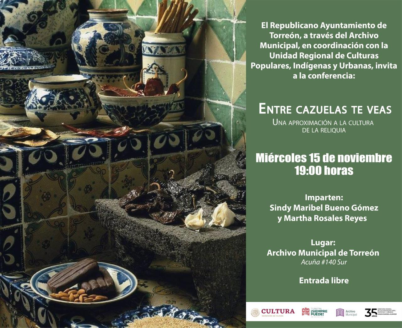 En la agenda de actividades del Archivo Municipal de Torreón está programada para el próximo miércoles 15 de noviembre la conferencia: “Entre cazuelas te veas. Una aproximación a la cultura de la reliquia”, evento organizado en conjunto con la Unidad Regional Durango de Culturas Populares, Indígenas y Urbanas.