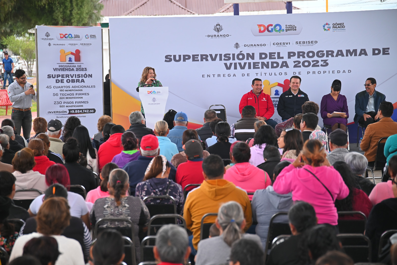 En un evento celebrado la mañana de hoy en el fraccionamiento Centenario, la alcaldesa gomezpalatina reconoció al gobernador del Estado, Esteban Villegas Villarreal, el apoyo que, desde el primer día de su administración, ha dispuesto para el pueblo gomezpalatino y como muestra de ello dijo que estas familias a las que les será construido a través de la Comisión Estatal de Suelo y Vivienda, (Coesvi) un cuarto adicional, una losa de concreto o un piso en su vivienda o les será entregado su título de propiedad, les mejorará significativamente su calidad de vida.