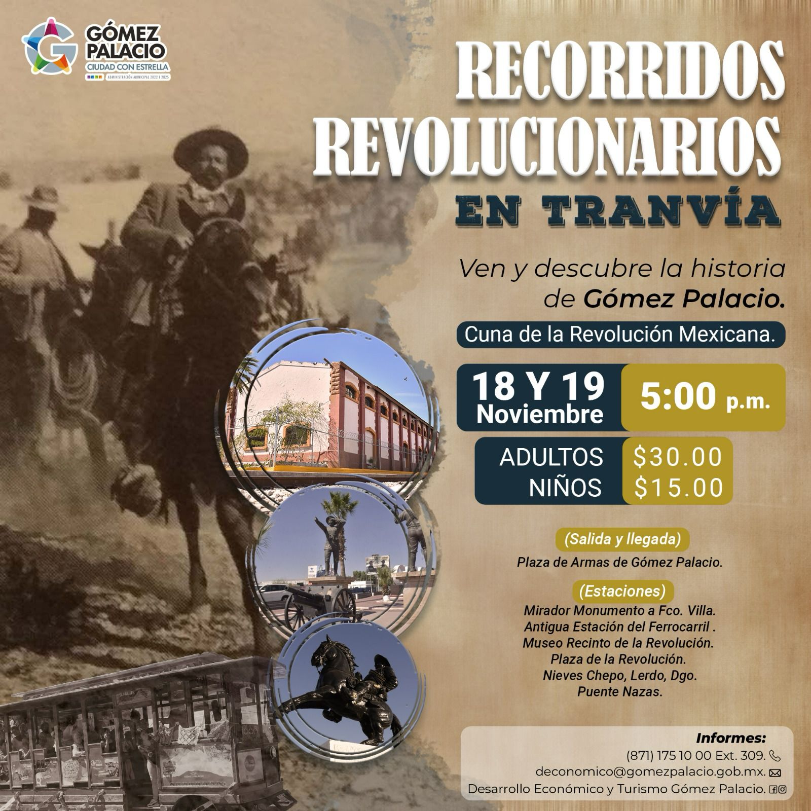 Con el objetivo de dar a conocer el acervo y paso de la Revolución Mexicana por nuestro municipio, el Ayuntamiento de Gómez Palacio, a través de la Dirección de Desarrollo Económico y Turismo, invita a la ciudadanía a aprovechar los “Recorridos Revolucionarios en Tranvías”, este 18 y 19 de noviembre.