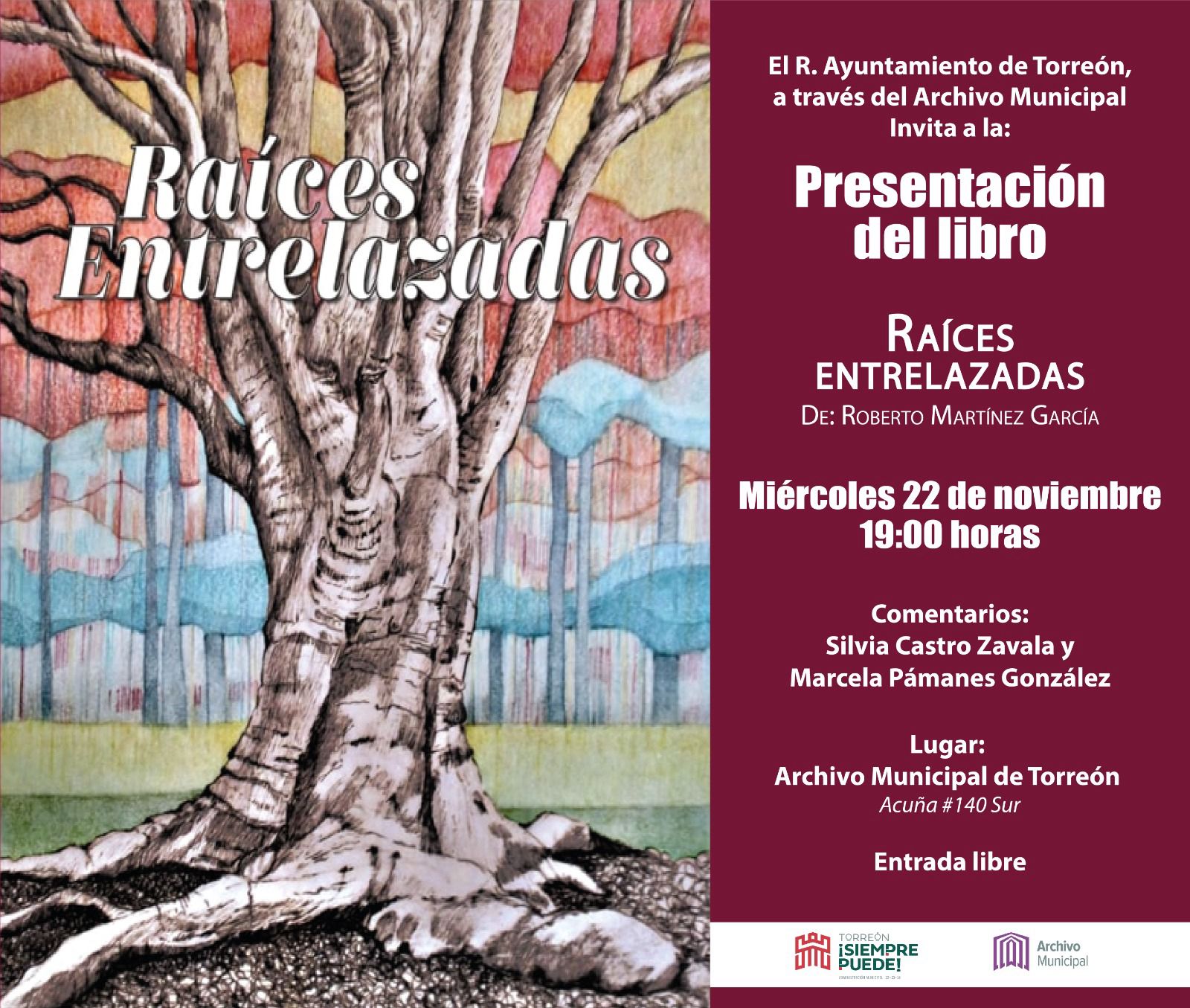 El Archivo Municipal de Torreón tiene preparada la presentación del libro “Raíces entrelazadas” de Roberto Martínez García; el evento se realizará el próximo miércoles 22 de noviembre a las 19:00 horas con entrada libre.