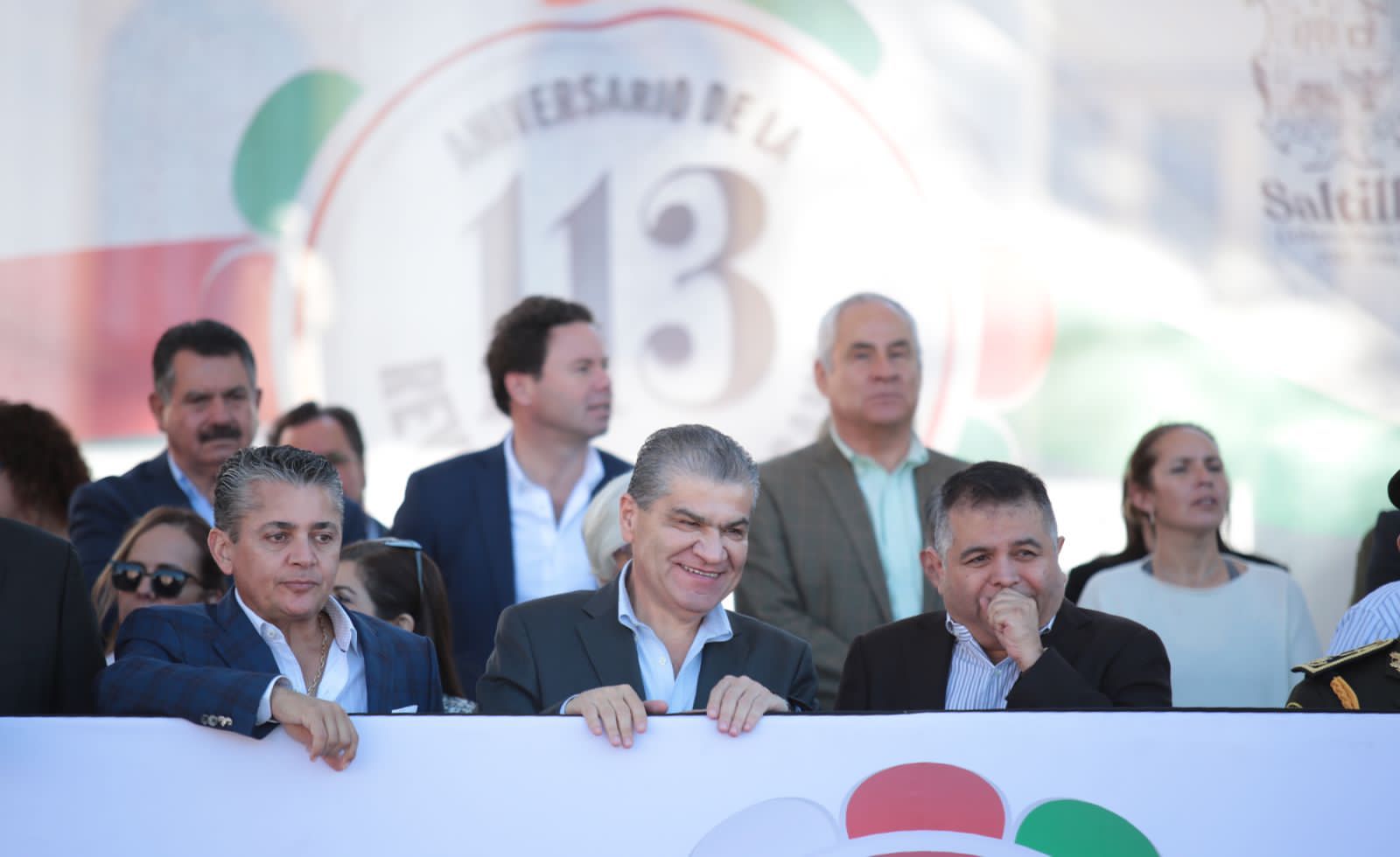 Saltillo, Coahuila de Zaragoza; a 20 de Noviembre de 2023.- El gobernador Miguel Ángel Riquelme Solís encabezó desde el presídium el desfile cívico deportivo conmemorativo al 113 Aniversario del inicio de la Revolución Mexicana, en el que estuvo acompañado por Eduardo Olmos Castro, diputado Presidente de la Junta de Gobierno del Congreso del Estado, y Miguel Felipe Mery Ayup, magistrado Presidente del Tribunal Superior de Justicia, así como de José María Fraustro Siller, Alcalde de Saltillo.