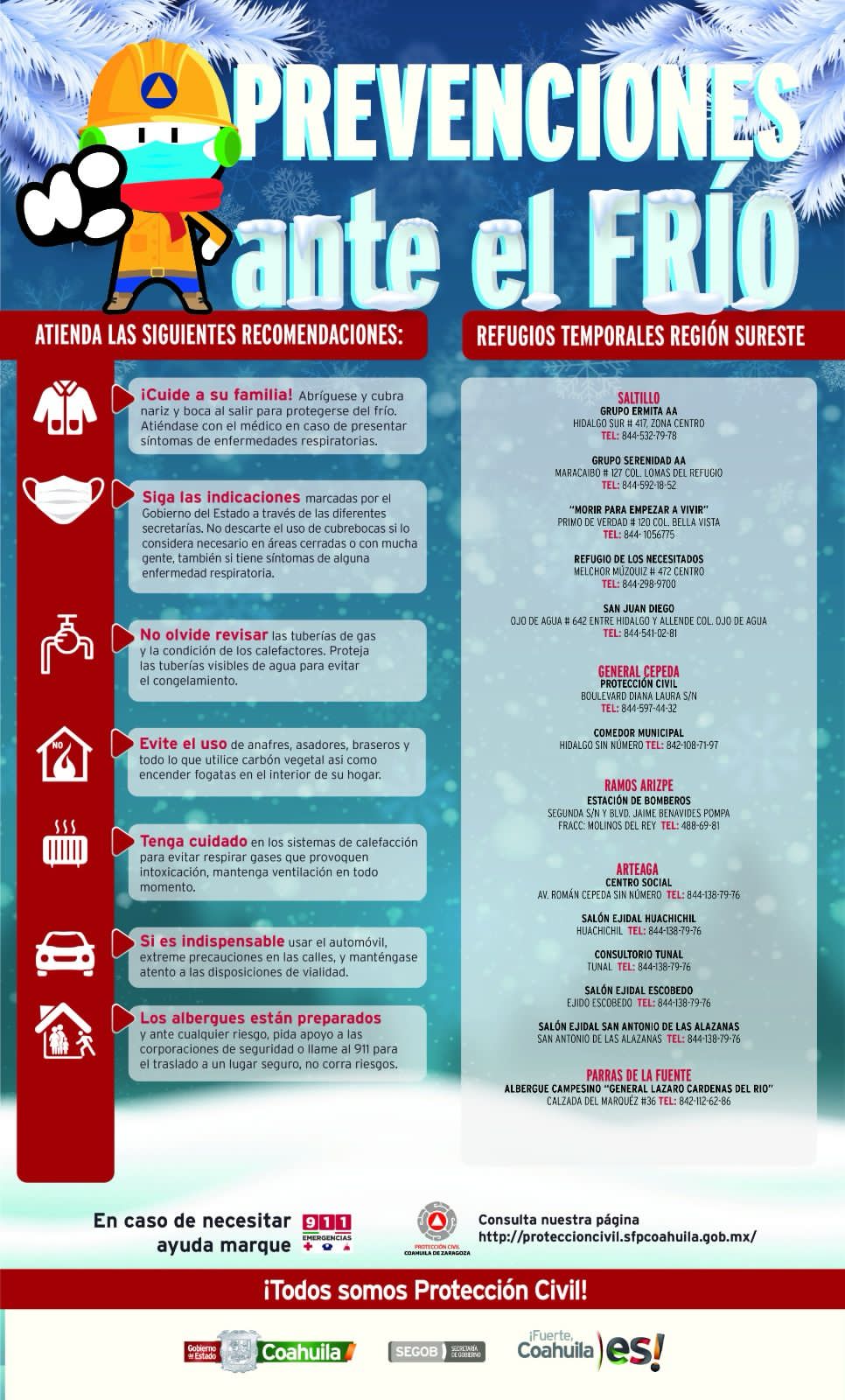 + Ubicar con anticipación los Refugios Temporales habilitados por las autoridades para estos casos en la página http://proteccioncivil.sfpcoahuila.gob.mx/modulo22.php?opcion=8.