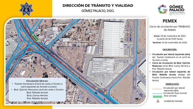 El Ayuntamiento de Gómez Palacio, a través de la Dirección de Tránsito y Vialidad, invita a la ciudadanía que transita por el bulevar Ejército Mexicano, entre el bulevar Carlos Herrera, hasta el cruce con la prolongación Rebollo Acosta (en el sentido de Torreón a Lerdo) a atender las indicaciones de los elementos de vialidad, pues habrá cierres a la circulación.