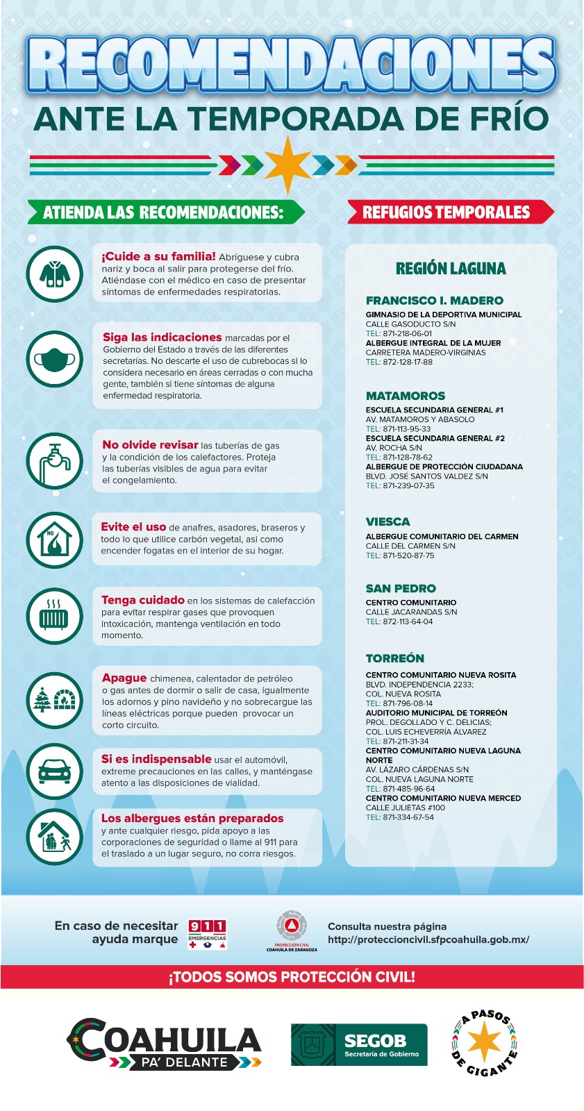 La Subsecretaría de Protección Civil de Coahuila (PC) informó en este sentido que ya se tienen habilitados los refugios temporales en todo el estado, operados de manera conjunta con las alcaldías y las Unidades Municipales de Protección Civil; para el caso de la región Laguna, se cuenta con refugios en Torreón, ubicados en el Centro Comunitario Nueva Rosita en bulevard Independencia 2233 poniente, colonia Nueva Rosita; en el Auditorio Municipal en prolongación Degollado y calle Delicias, colonia Luis Echeverría Álvarez; en el Centro Comunitario Nueva Laguna Norte, en avenida Lázaro Cárdenas de la colonia Nueva Laguna Norte y en el Centro Comunitario Nueva Merced, en calle Julietas número 100, colonia Nueva Merced.