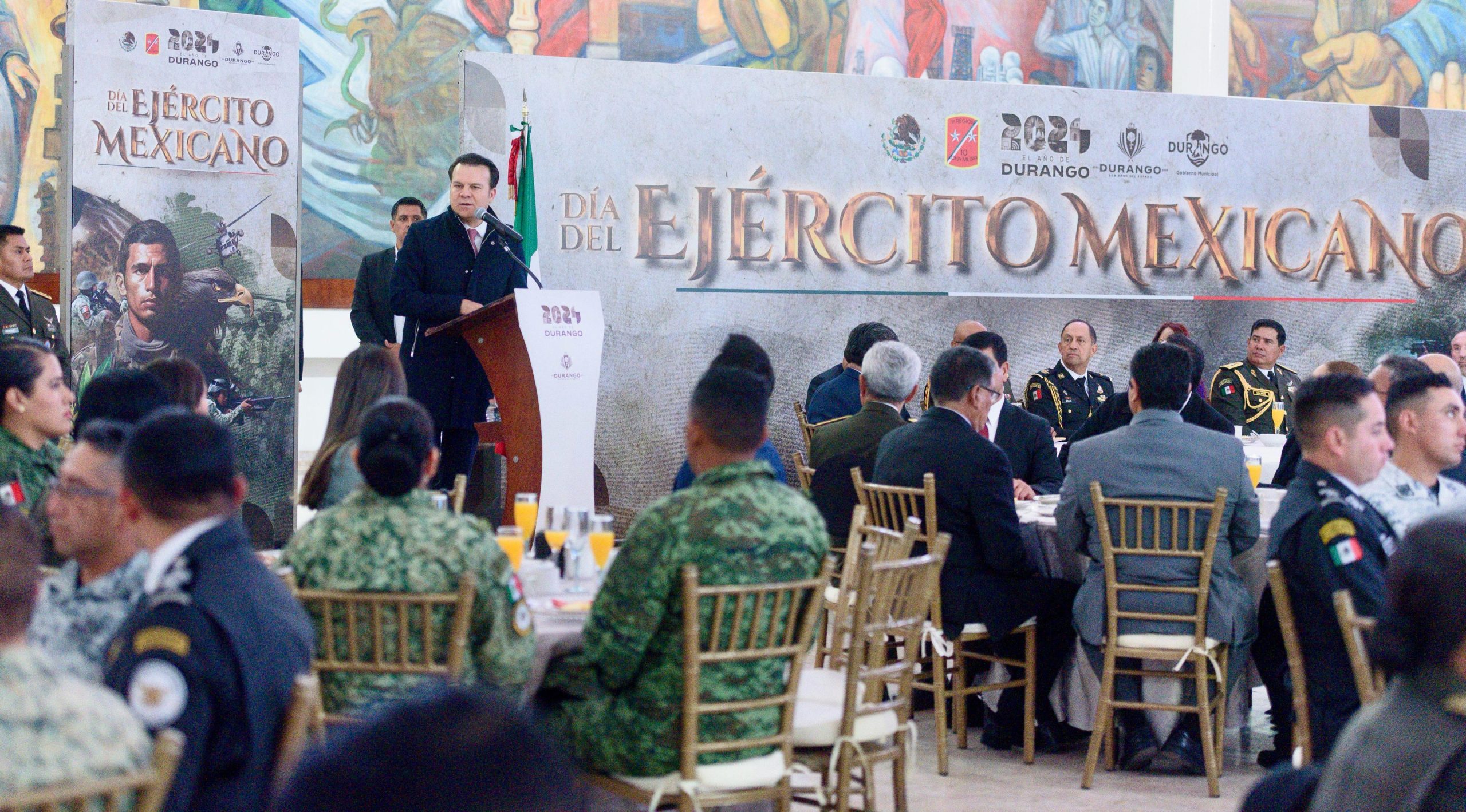 Durango no se podría concebir en este momentos sin la ayuda del Ejército Mexicano y después de haber vivido momentos complejos, ahora la sociedad está tranquila, segura y en paz, aseguró el Mandatario Estatal al encabezar los actos conmemorativos; primero con el depósito de una ofrenda floral en el monumento al Defensor de la Patria y después, celebrar junto al personal militar, a quienes reconoció su esfuerzo y dedicación.