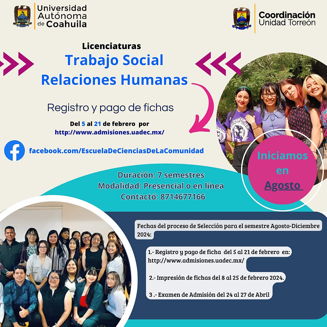 TORREÓN, Coahuila. 19 de febrero de 2024. La Universidad Autónoma de Coahuila a través de la Escuela Ciencias de la Comunidad Unidad Torreón, invita a cursar las licenciaturas de Trabajo Social y Relaciones Humanas para el semestre agosto-diciembre de 2024.