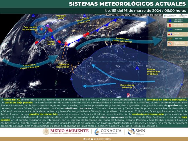Saltillo, Coahuila de Zaragoza; a 18 de marzo de 2024.- La Subsecretaría de Protección Civil del Estado (PC) informa que este sábado, el frente frío número 40 se extenderá con características estacionarias sobre el norte y noreste del país, ocasionando lluvias puntuales muy fuertes, descargas eléctricas, posible caída de granizo, rachas de viento de hasta 70 km/h y probable formación de torbellinos o tornados en las regiones Norte, Carbonífera y Centro de Coahuila.