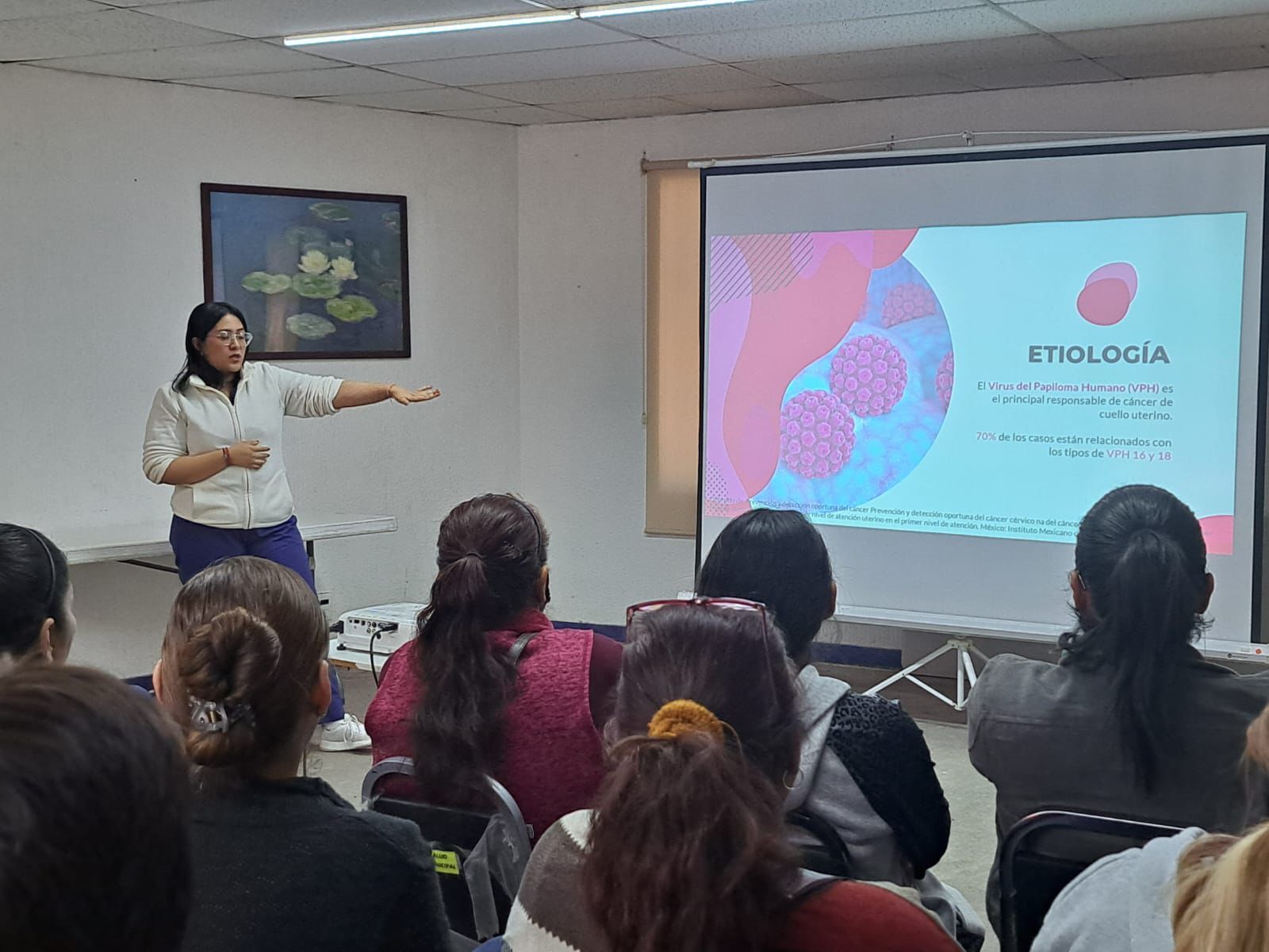 Personal de la Dirección de Salud Municipal impartió una plática informativa, con motivo del Día Mundial contra el Cáncer Cervicouterino, para concientizar a la población sobre el tratamiento oportuno de esta enfermedad.
