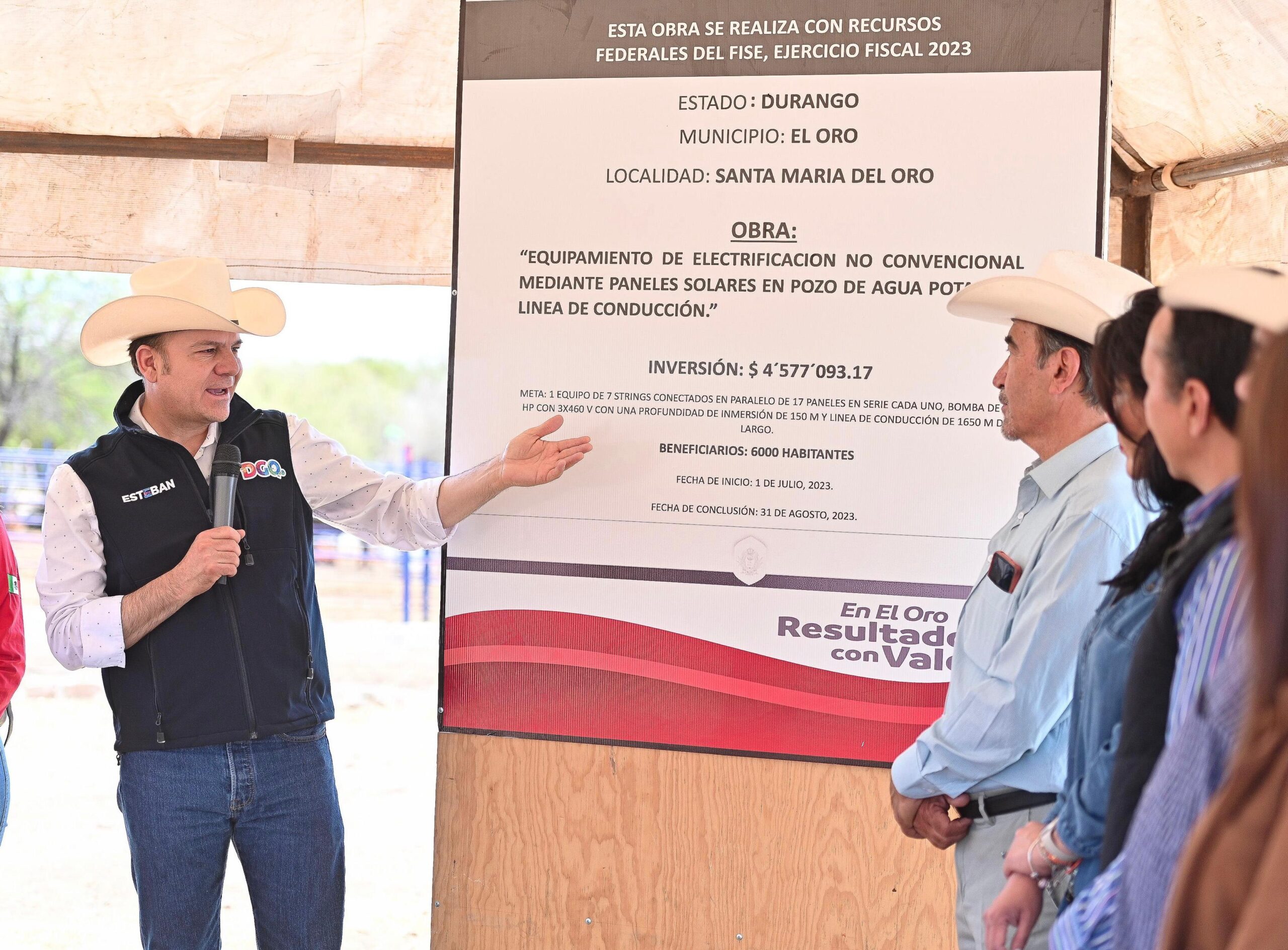 • El gobernador Esteban Villegas Villarreal realizó una gira de trabajo por el municipio del Santa María del oro, donde supervisó el funcionamiento del pozo de agua potable y la línea de conducción con equipamiento de electrificación no convencional mediante paneles solares, el cual lleva una inversión de 4.5 millones de pesos y un beneficio para 600 habitantes.