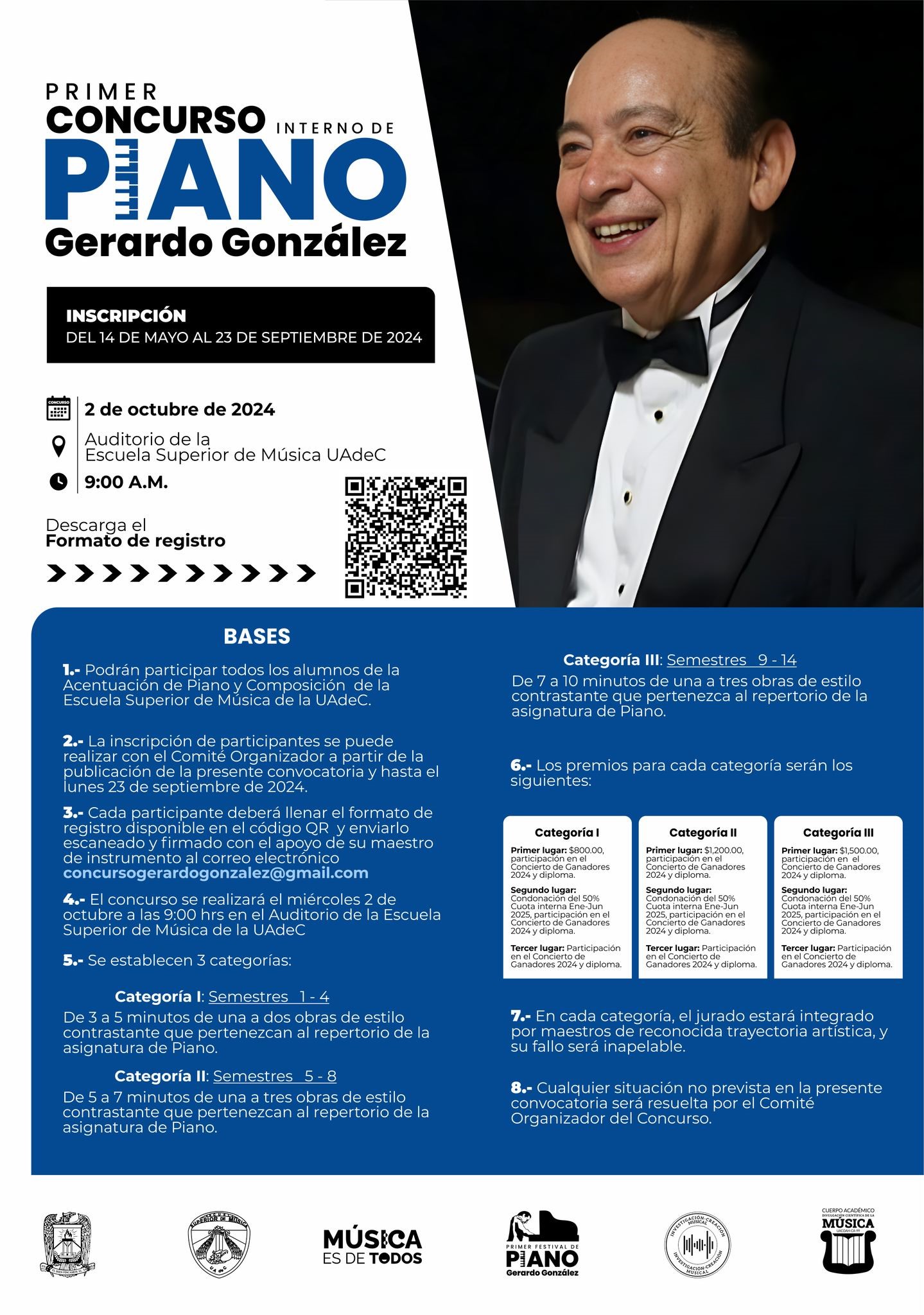 SALTILLO, Coahuila. 1 de agosto de 2024. La Escuela Superior de Música (ESMUAC) de la Universidad Autónoma de Coahuila, llevará a cabo el 2 de octubre de 2024 su Primer Concurso Interno de Piano “Gerardo González”, en homenaje a quien fue docente del plantel y un pianista de renombre con más de 50 años de carrera.