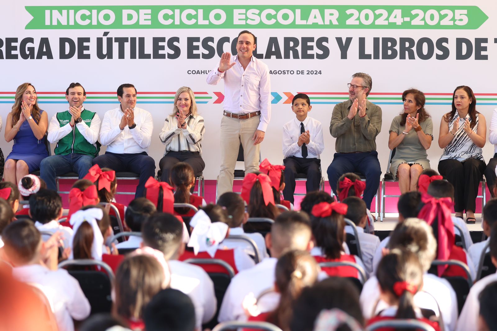 «Desde Piedras Negras estamos dando arranque al ciclo escolar 2024-2025, donde además entregamos obras a la Escuela Primaria Centenario y detonamos la entrega de paquetes de útiles escolares gratuitos que llegarán a más de medio millón de niñas, niños y adolescentes de todas las primarias, preescolares y secundarias públicas de Coahuila. Juntos estamos reforzando una de las herramientas más poderosa para prosperar: la educación», destacó el gobernador.