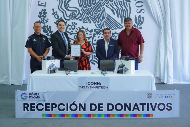 Por parte de 7-Eleven/Petro-7 destinados a fortalecer las labores de vigilancia del municipio, como una muestra más de la confianza que la iniciativa privada tiene hacia la administración que encabeza la Presidenta Municipal Leticia Herrera Ale, la empresa 7-Eleven/Petro-7 donó al Ayuntamiento 2 dones para que la Dirección de Seguridad Pública Municipal cuente con más equipamiento para el cumplimiento de sus funciones.En un evento realizado en el Auditorio Benito Juárez de la Presidencia Municipal de Gómez Palacio, la alcaldesa expresó que estos drones fortalecen las labores preventivas y permitirán una mejor capacidad de reacción ante determinadas circunstancias en que tener una visión aérea facilita el trabajo de la corporación municipal.Ramón Francisco León López, gerente de Relaciones Institucionales de 7-Eleven/Petro-7, fue el encargado de entregar los dos drones, y al hacerlo destacó el compromiso que su empresa tiene con el bienestar de la comunidad, por ello realizan este donativo, pues ellos mismos pueden atestiguar, el compromiso que tienen los elementos de la policía municipal de Gómez Palacio, cada vez que han realizado un llamado de ayuda. La Presidenta Municipal Leticia Herrera Ale agradeció el apoyo: “Me da mucho gusto saber que la iniciativa privada está siempre dispuesta a apoyarnos; empresas como 7-Eleven/Petro-7 son un ejemplo de que, en equipo, podemos construir la sociedad que todos deseamos, por ello recibimos con mucha satisfacción este donativo”.Este tipo de medidas fortalecen la estrategia de seguridad que de manera coordinada con el Ejército Nacional, Guardia Nacional, Mando Especial, así como las corporaciones Estatales de seguridad, han permitido una significativa reducción en los índices delictivos desde que inició la presente administración.