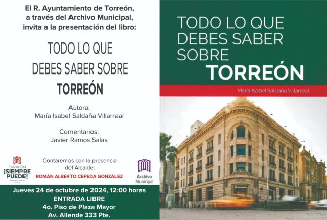 Torreón, Coahuila. A 22 de octubre de 2024.El Municipio de Torreón, a través del Archivo Municipal, presentará el libro: “Todo lo que debes saber sobre Torreón”, de María Isabel Saldaña Villarreal, este próximo jueves en el cuarto piso de la Presidencia Municipal, a las 12:00 horas.Los comentarios estarán a cargo de Javier Ramos Salas, miembro de la Academia Nacional de Historia y Geografía Filial Coahuila.Cinthia Gaspar Montero, directora del Archivo Municipal, dijo que a través de una profunda investigación, la autora María Isabel Saldaña Villarreal, invita a descubrir la grandeza de Torreón, sus personajes más destacados y los momentos históricos que forjaron las bases de este municipio.“Da un repaso desde los antecedentes prehistóricos y climáticos, los colonos españoles y las primeras actividades productivas, hasta la modernización porfiriana y la coyuntura revolucionaria”, externó.Dijo también que en cada una de estas historias se distingue la perseverancia de los hombres y las mujeres que, dedicados a las más diversas actividades, hicieron de Torreón una tierra para echar raíces, para construir un nuevo futuro.Este libro, además de la narrativa histórica, hace énfasis en el desarrollo de la ciudad impulsado por su vocación industrial y comercial, con empresas consolidadas a nivel nacional e internacional. El libro además da a conocer el paisaje urbano de Torreón como sus edificios, monumentos, museos y plazas, destacando los lugares emblemáticos que brindan identidad y marcan algunos hitos culturales de la comunidad.María Isabel Saldaña Villarreal, actualmente escribe la columna “Cartel de espejos” en Milenio Diario Laguna. Desde septiembre de 2021 es miembro de número del Colegio Coahuilense de Investigaciones Históricas.- Torreón ¡Siempre Puede! –