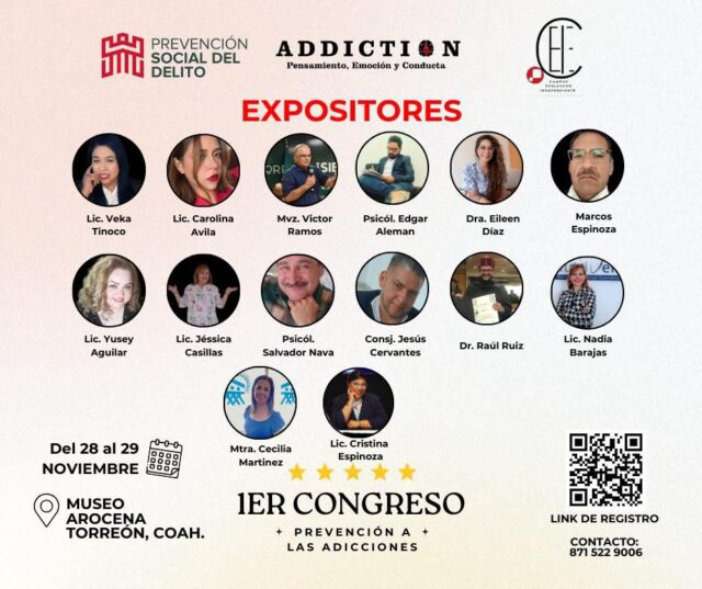 Torreón, Coahuila. A 28 de noviembre de 2024El Municipio de Torreón invita al primer Congreso de Prevención de Adicciones, que se desarrollará el 28 y 29 de noviembre de 2024, en las instalaciones del Museo Arocena. La actividad es llevada a cabo a través de la Dirección de Prevención Social del Delito. Víctor Ramos Galindo, director de la dependencia, destacó que es importante atender las causas que originan muchos de los problemas en el contexto social, como el prevenir el consumo de sustancias ilícitas. Se trata dijo, de promover acciones para reconstruir el tejido social y generar oportunidades para la población. Dijo que este congreso es un trabajo coordinado con el Campus Evaluador Independiente, que está acreditado por un Organismo Certificador y registrado ante la Secretaría de Educación Pública (SEP), a través del Consejo Nacional de Normalización y Certificación de Competencias Laborales (CONOCER).Ramos Galindo especificó que el jueves 28 de noviembre, las ponencias irán dirigidas a jóvenes estudiantes y padres de familia. En cambio, para el viernes 29, las temáticas serán preparadas para operadores, dueños y encargados de centros de rehabilitación, con el objetivo de que conozcan cómo manejar adecuadamente estos lugares, con base a la norma oficial 028.“Esta norma atiende lo relacionado a la prevención, tratamiento y control de las adicciones, señala los protocolos determinados que deben cumplir estos centros”, indicó el director. Señaló que durante el Congreso se indagará también en temas como nutrición y qué impacto tiene la drogadicción en este aspecto; reinserción social y neurociencia aplicada, entre otros.Entre los expositores estarán: Edgar Alemán, Eileen Díaz, Marcos Espinoza, Jessica Casillas, Carolina Ávila y Salvador Nava, por citar algunos.El director dijo que en la Administración Municipal del alcalde Román Alberto Cepeda González ha sido una prioridad el abrir este tipo de espacios, así como impulsar campañas y programas que fortalezcan la prevención de las adicciones y el delito. Para más información y registro al Congreso, los interesados se pueden comunicar al contacto 871 522 90 06.-Torreón ¡Siempre Puede! –