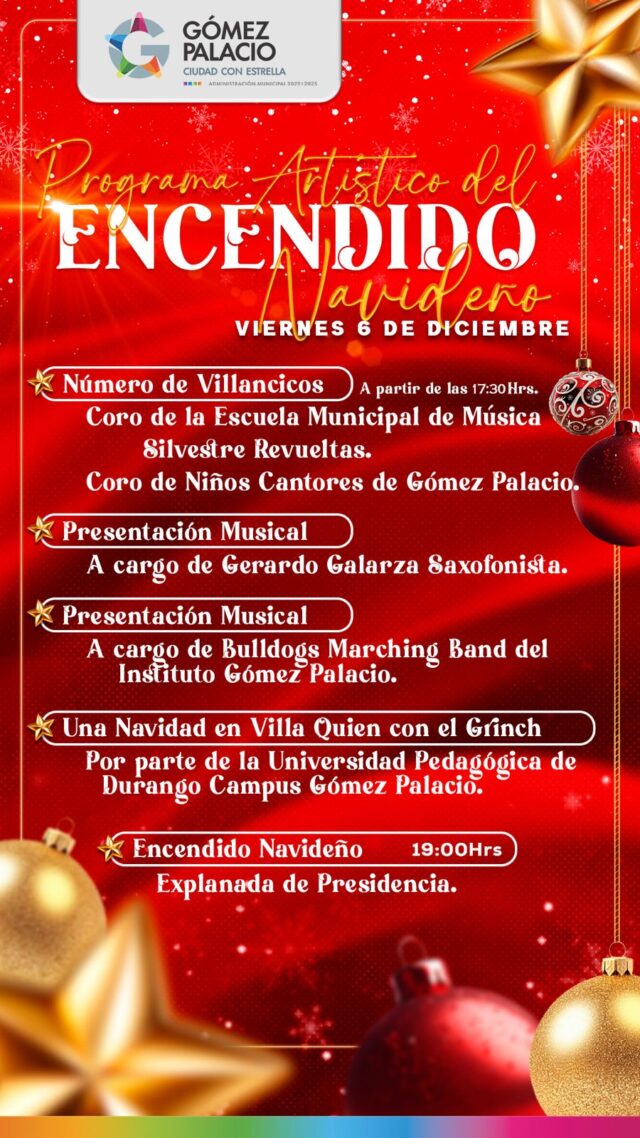 + A las 7 p.m. se llevará a cabo el encendido del Nacimiento Monumental y el Pino Navideño.El Ayuntamiento de Gómez Palacio, a través de la Dirección de Arte y Cultura, invita a todos los gomezpalatinos a disfrutar del espectáculo artístico que se realizará previo al encendido del monumental nacimiento, este próximo viernes 6 de diciembre a partir de las 5:30 p.m. en la explanada de la Presidencia Municipal, en donde se contará con la participación de diversos grupos locales que interpretarán villancicos y llevarán a cabo otras presentaciones culturales.Melissa Reuter Pérez, directora de Arte y Cultura, informa que además del encendido del monumental Nacimiento que tendrá lugar a las 19:00 horas en la explanada de la Presidencia Municipal, se decorará la calle Independencia con motivos navideños.Antes de la ceremonia de encendido, habrá un programa artístico que incluirá villancicos interpretados por el Coro de la Escuela Municipal de Música Silvestre Revueltas y el Coro de Niños Cantores de Gómez Palacio, así como una actuación musical del reconocido saxofonista Gerardo Galarza.El programa también contará con la participación de la Bulldogs Marching Band del Instituto Gómez Palacio y la representación de “Una Navidad en Villa Quien con El Grinch”, a cargo de la Universidad Pedagógica de Durango, Campus Gómez Palacio.La Presidenta Municipal Leticia Herrera Ale ha instruido a las dependencias correspondientes para asegurar que el evento se realice en un ambiente festivo y seguro, propiciando un espacio de sana convivencia para todas las familias que deseen participar.Reuter Pérez reitera la invitación a todos los ciudadanos para que asistan y disfruten de la variedad de actividades preparadas para celebrar esta Navidad.