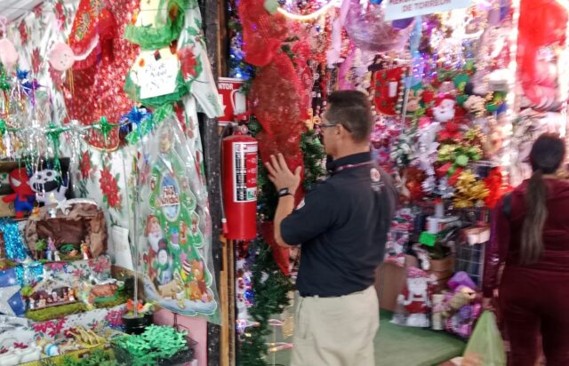 Torreón, Coahuila. A 5 de diciembre de 2024Personal de la Dirección de Protección Civil y Bomberos de Torreón, realizó un recorrido por el mercadito navideño, como seguimiento a las acciones de inspección de las medidas de seguridad que se llevaron a cabo desde que se instalaron los comerciantes.Jorge Luis Juárez Llanas, director de la dependencia, indicó que el personal verificó las instalaciones eléctricas y el equipo de seguridad con que el que deben contar los locatarios para atender cualquier tipo de emergencia.“Deben contar con extintores, pasillos libres para que delimiten las rutas de evacuación como forma de prevención de cualquier evento, también hicimos de su conocimiento algunas de las áreas de oportunidad que deben trabajar”, comentó.Este espacio de venta de artículos navideños se encuentra abierto desde el pasado 18 de noviembre y estará presente hasta el 27 de diciembre sobre la calle Ildefonso Fuentes entre las avenidas Hidalgo y Juárez.El funcionario manifestó que desde la apertura de este mercadito se realizó la primera inspección, y se mantendrán de manera periódica durante su permanencia, a fin de evitar cualquier tipo de riesgo.Juárez Llanas recomendó a los comerciantes tener especial cuidado con el cableado de luces y series navideñas, colocándolas de manera que estén ocultas para que no tengan contacto con quienes acuden al mercadito y evitar que queden expuestos que generen un riesgo de descargas eléctricas.Para quienes acuden a realizar sus compras, el director los exhortó a estar atentos a los pequeñitos que los acompañan, para con ello evitar que exista algún riesgo o extravío.Mencionó que en caso de observar que exista algún riesgo o en alguna situación de emergencia se comuniquen de inmediato a la Dirección de Protección Civil y Bomberos de Torreón, mediante el número de contacto es el 871 712 00 66, o al sistema de emergencias 911.-Torreón ¡Siempre Puede! –