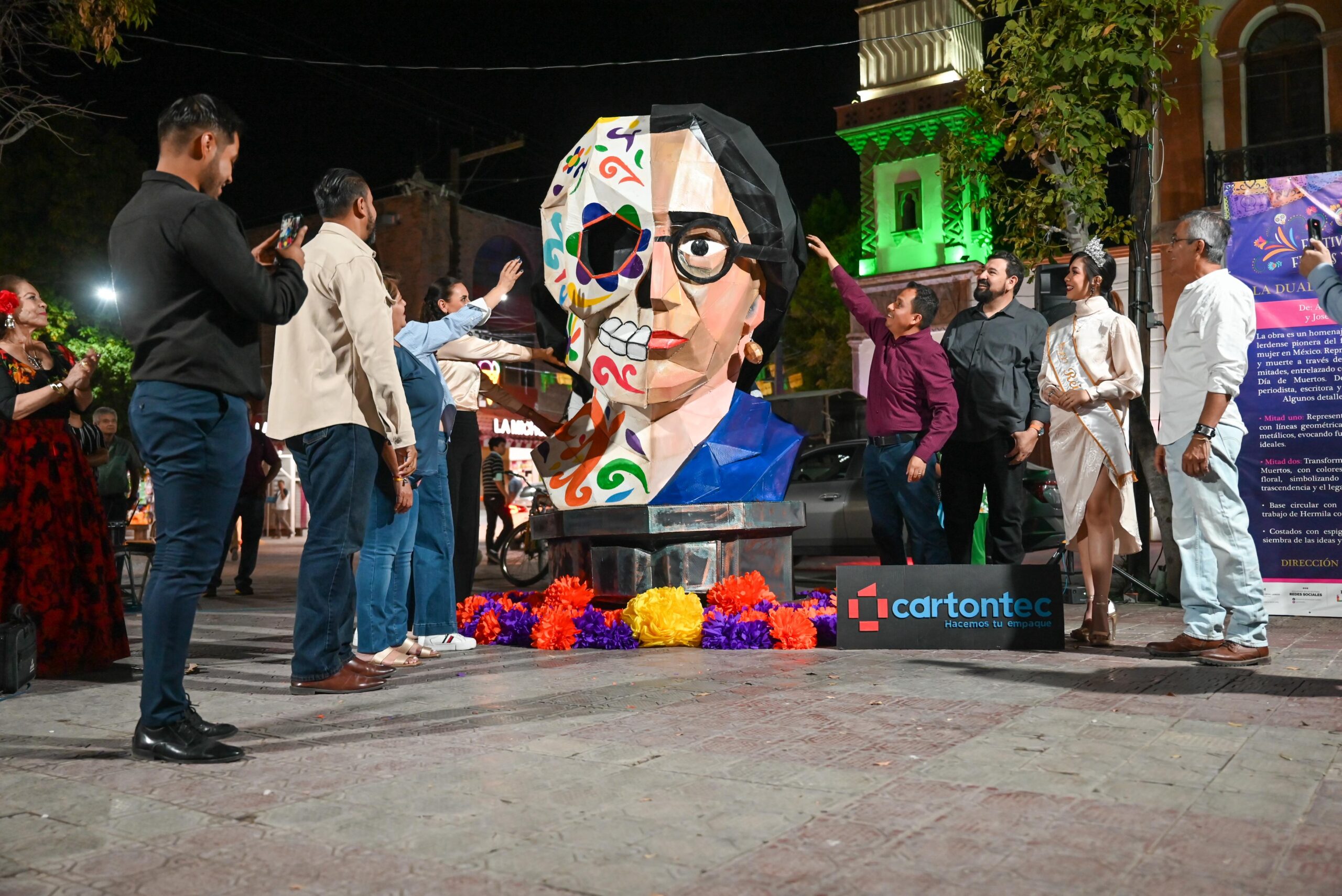 *Lerdo, 28 de octubre 2025.- La noche del lunes 27 de octubre, la dirección de Arte y Cultura inauguró en la plaza principal de Lerdo, frente al famoso Reloj de la Ciudad, la escultura de cartonería mexicana, denominada «La Dualidad de Hermila», creada por los artistas Alex Daniel Esquivel y José Manuel Zamora, en honor a la mujer lerdense pionera del feminismo y del voto de la mujer en México, Hermila Galindo Acosta.La obra representa la dualidad de la vida y la muerte a través de un rostro dividido en dos mitades, entrelazando la tradición mexicana del Día de Muertos con su papel como periodista, escritora, luchadora social y política. Por un lado, se encuentra Hermila Galindo en vida, evocando fuerza firmeza y claridad en sus ideales. Mientras que en el otro perfil, transformada en una calavera con flores vibrantes y ornamentación floral, simboliza la tradición mexicana de la trascendencia y el legado eterno de sus aportaciones. La base circular simboliza el trabajo de Hermila como periodista y escritora, mientras que los costados con espigas geométricas representan la siembra de las ideas y valores a través de su lucha.En representación de la Presidenta Municipal Susy Carolina Torrecillas Salazar, el secretario técnico del Ayuntamiento y coordinador de Gabinete Juan José Carrillo Aldaba mencionó que «Lerdo es un municipio que respalda la cultura» y, aprovechando la festividad tradicional del Día de Muertos, el Gobierno Municipal realiza numerosas actividades promoviendo diferentes expresiones artísticas y culturales, por lo que invitó a la ciudadanía para ser partícipe de los eventos que se estarán desarrollando en el marco del Día de Muertos, mismas que se difunden a través de las redes sociales oficiales del municipio.En este magno evento también se contó con la presencia del director de Arte y Cultura Héctor Escamilla Ávila; los artistas Alex Daniel Esquivel y José Manuel Zamora; la Síndico Municipal Esmirna Gutiérrez; la regidora y presidenta de la Comisión de Arte y Cultura Alina Rivera; la directora de Turismo María José Lazo; la Reina de Lerdo Yuztra Grijalva; la representante de la Unidad Regional de Culturas populares Elena Calderón; el presidente de la delegación de la Cámara Nacional de la Industria de Transformación (CANACINTRA) en Gómez Palacio, Pedro Aguirre; y en representación del director del Instituto de Cultura del Estado de Durango (ICED), Francisco Javier Pérez, el director de la casa de cultura de Gómez Palacio, Absalom Ruiz.Posteriormente hicieron el corte de listón de la Mega Catrina de 10 metros instalada frente al asta bandera de la plaza principal (misma que se encuentra entre avenida Francisco Sarabia y calle Hidalgo), y fue donada por el Instituto de Cultura del Estado.Para embellecer el evento se contó con la participación de la Banda Sinfónica Infantil y Juvenil de Lerdo, y la cantante de música regional Rosario “Chayito” Martínez.