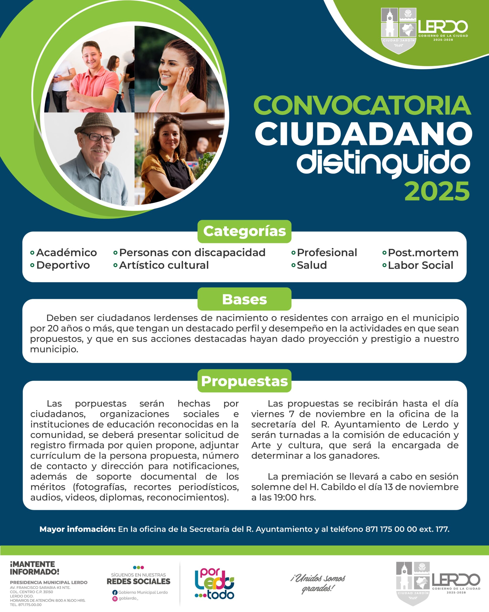 *”*Lerdo, 28 de octubre 2025.- La Secretaría del Ayuntamiento de Lerdo exhorta a la población a presentar sus propuestas para el reconocimiento “Ciudadano Distinguido 2025”, con motivo de la celebración del 131 aniversario de Ciudad Lerdo, Durango.Este reconocimiento tiene como propósito distinguir a ciudadanas y ciudadanos lerdenses, de nacimiento o con al menos 20 años de residencia en el municipio, que se hayan destacado por su labor en las categorías Académico, Artístico-Cultural, Deportivo, Labor Social, Profesional, Persona con Discapacidad, Salud y Post-Mortem.Las propuestas podrán ser presentadas por ciudadanos distinguidos ante la Secretaría del Ayuntamiento, así como por organizaciones sociales e instituciones educativas reconocidas en la comunidad. Deberán incluir la solicitud de registro firmada por quien propone, acompañada del currículum de la persona nominada, número de contacto, dirección para notificaciones y documentación que respalde sus méritos (fotografías, recortes periodísticos, audios, videos, diplomas, reconocimientos, entre otros).El registro de propuestas cerrará el miércoles 5 de noviembre a las 14:00 horas del presente año. Las postulaciones serán recibidas en la oficina de la Secretaría del Ayuntamiento y turnadas a la Comisión de Educación, Arte y Cultura, encargada de determinar a los ganadores.La ceremonia de premiación se llevará a cabo durante la sesión solemne del Honorable Cabildo, el próximo jueves 13 de noviembre, en el Teatro Hermila Galindo.
