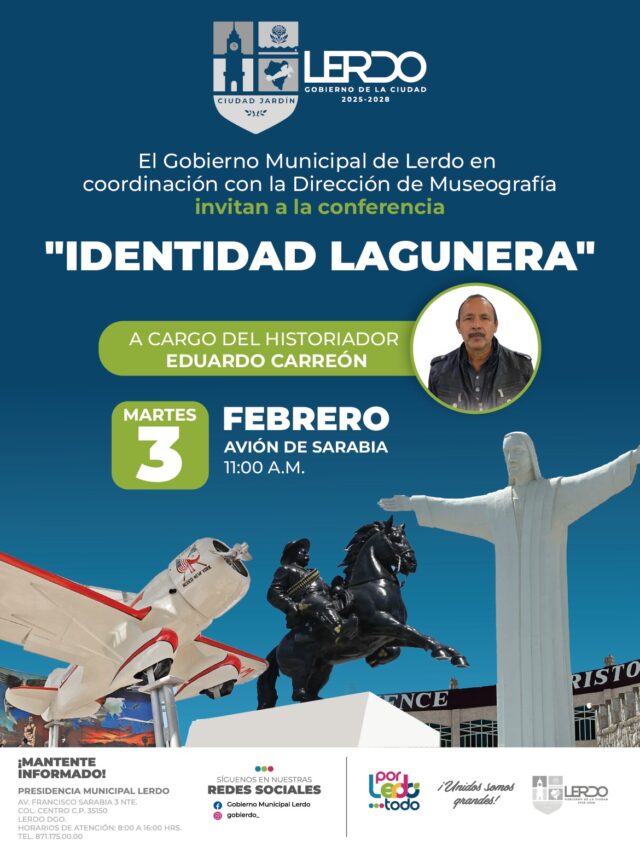 Lerdo, 02 de febrero 2026.- El Gobierno Municipal de Lerdo, a través de la Dirección de Museografía, invita a la ciudadanía en general a la conferencia magistral «Identidad Lagunera», que se desarrollará este martes 03 de febrero en el Museo Internacional del C.P.A. Francisco Sarabia Tinoco, mejor conocido como «Museo Avión de Sarabia».